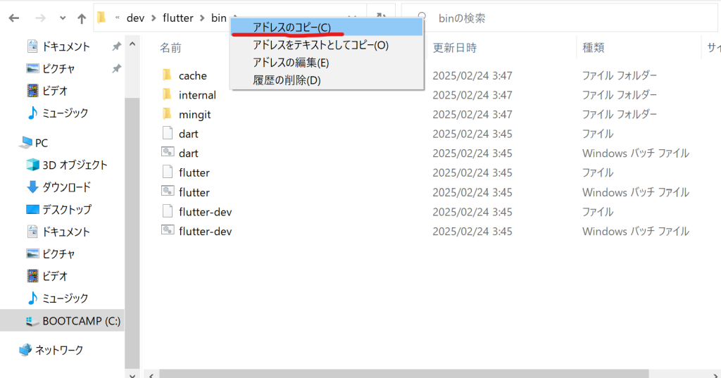 ファイルのパスはbinフォルダをダブルクリックして、画像上部のdev > flutter > bin > のbinの場所を右クリックしてアドレスのコピーをクリックすることでコピーできます。