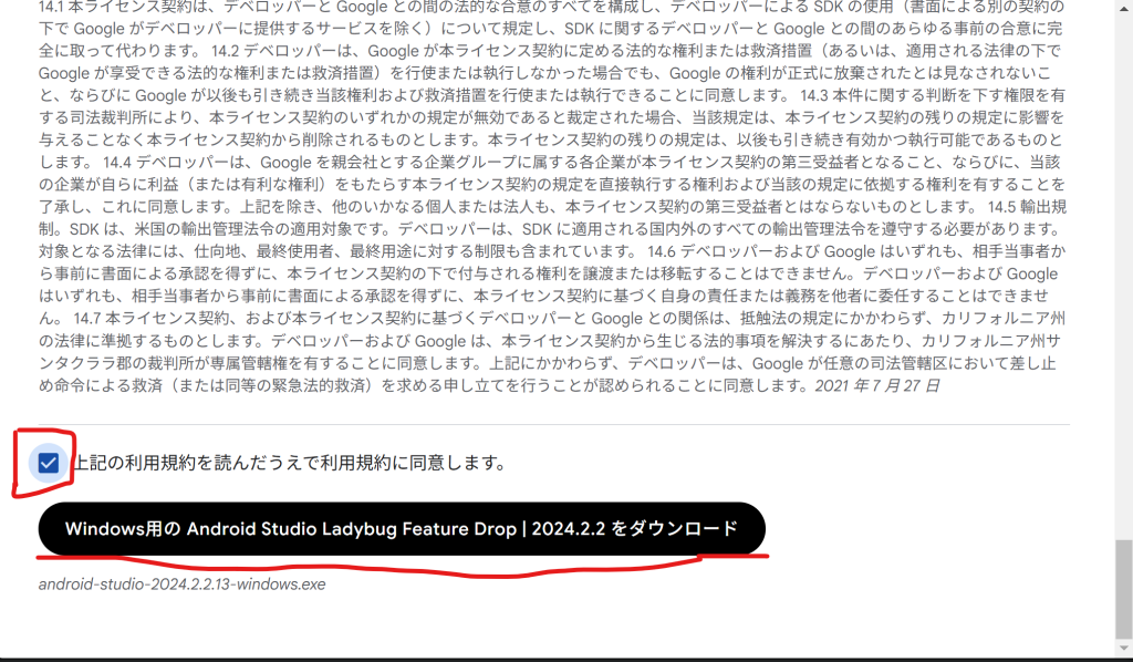利用規約文末の同意にチェックを入れ、ダウンロードを押します。