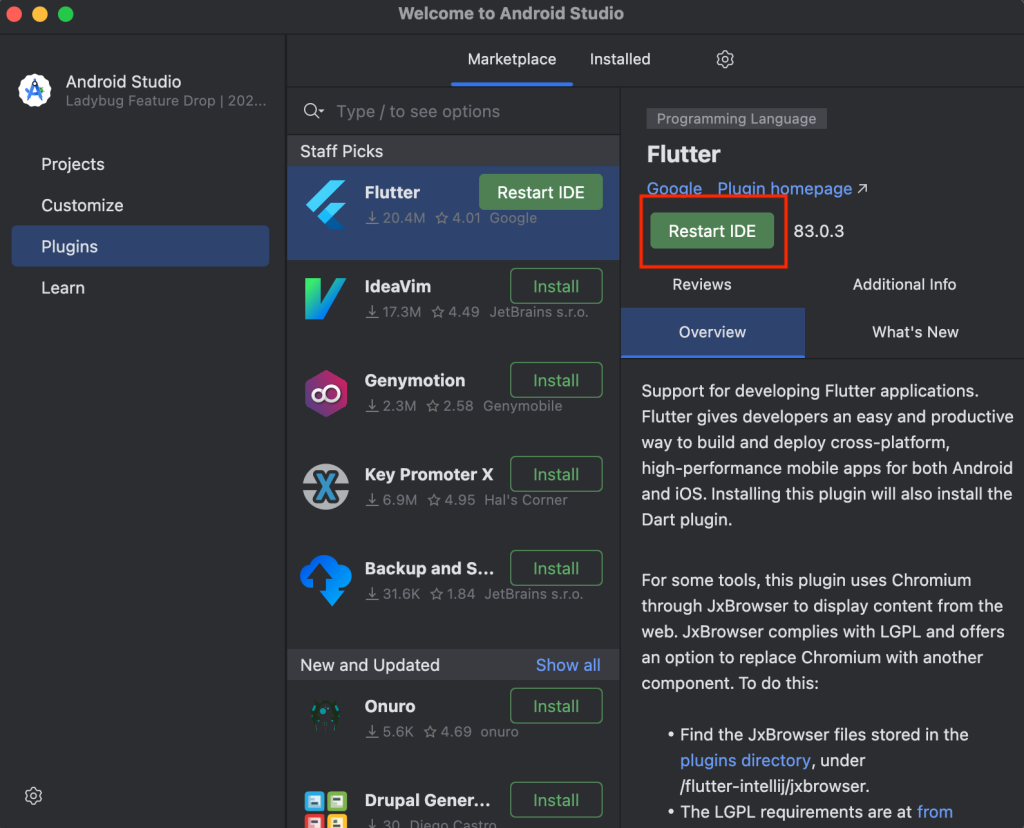 Android Studio を開き、Plugin から flutter を検索し、インストールをクリックします。