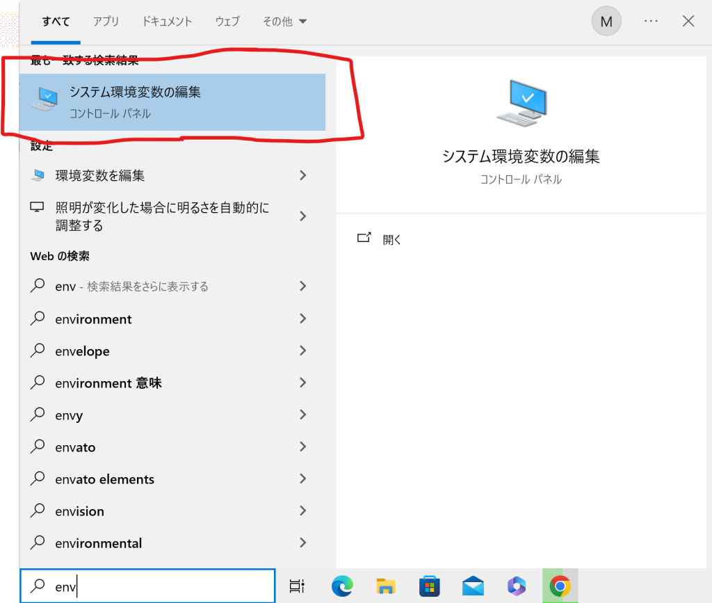 検索欄からenvと打ち込んでコントロールパネルを開きます。
