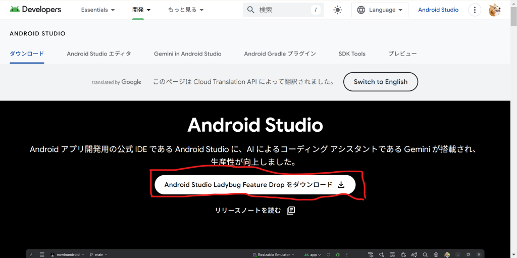 こちらの公式サイトからAndroid Studioをダウンロードします。